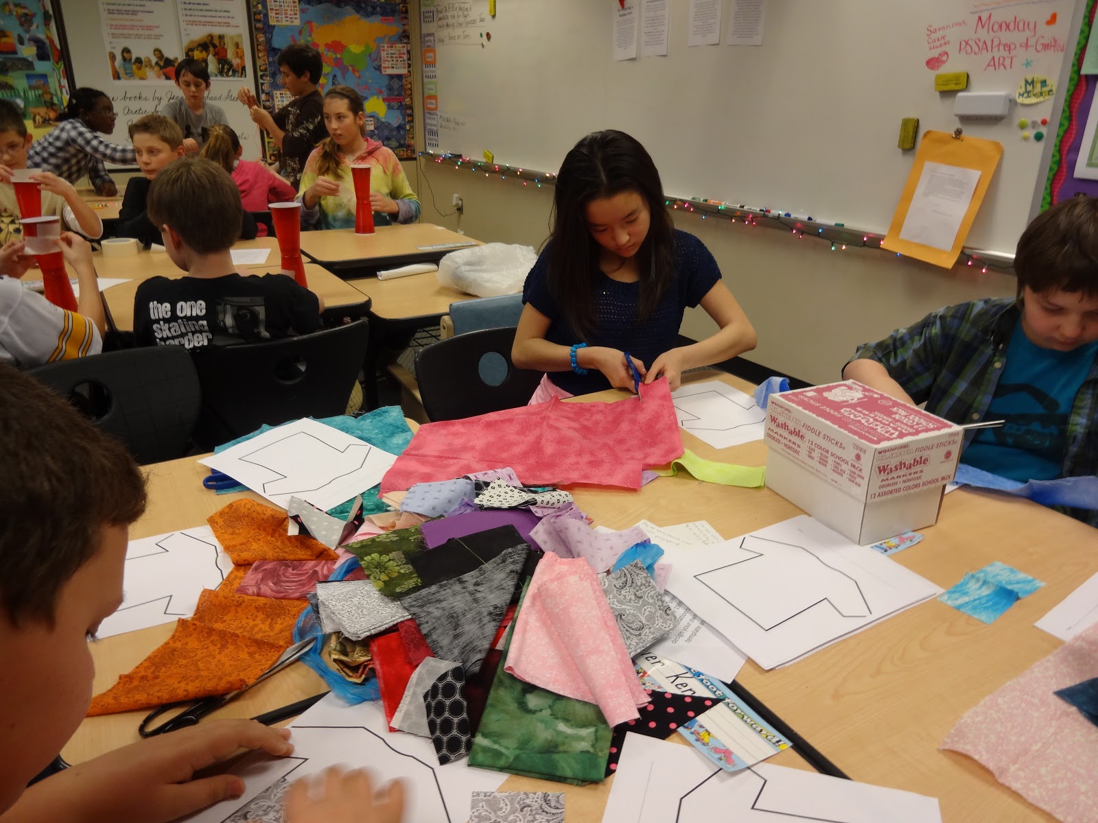 In Social Studies, Miss Albitz presented four African Art stations for students to visit as a culmination to her teaching. The students visited two of the stations today, and they'll visit two stations tomorrow. In one station, the students designed their own Madiba shirt using bits of colorful fabric. In station two, they created drums. Station 3 gave them a chance to make cowry shell jewelry, while in station 4, they were able to write in modern standard Arabic using an alphabet. The students enjoyed each station they visited and are looking forward to more tomorrow.